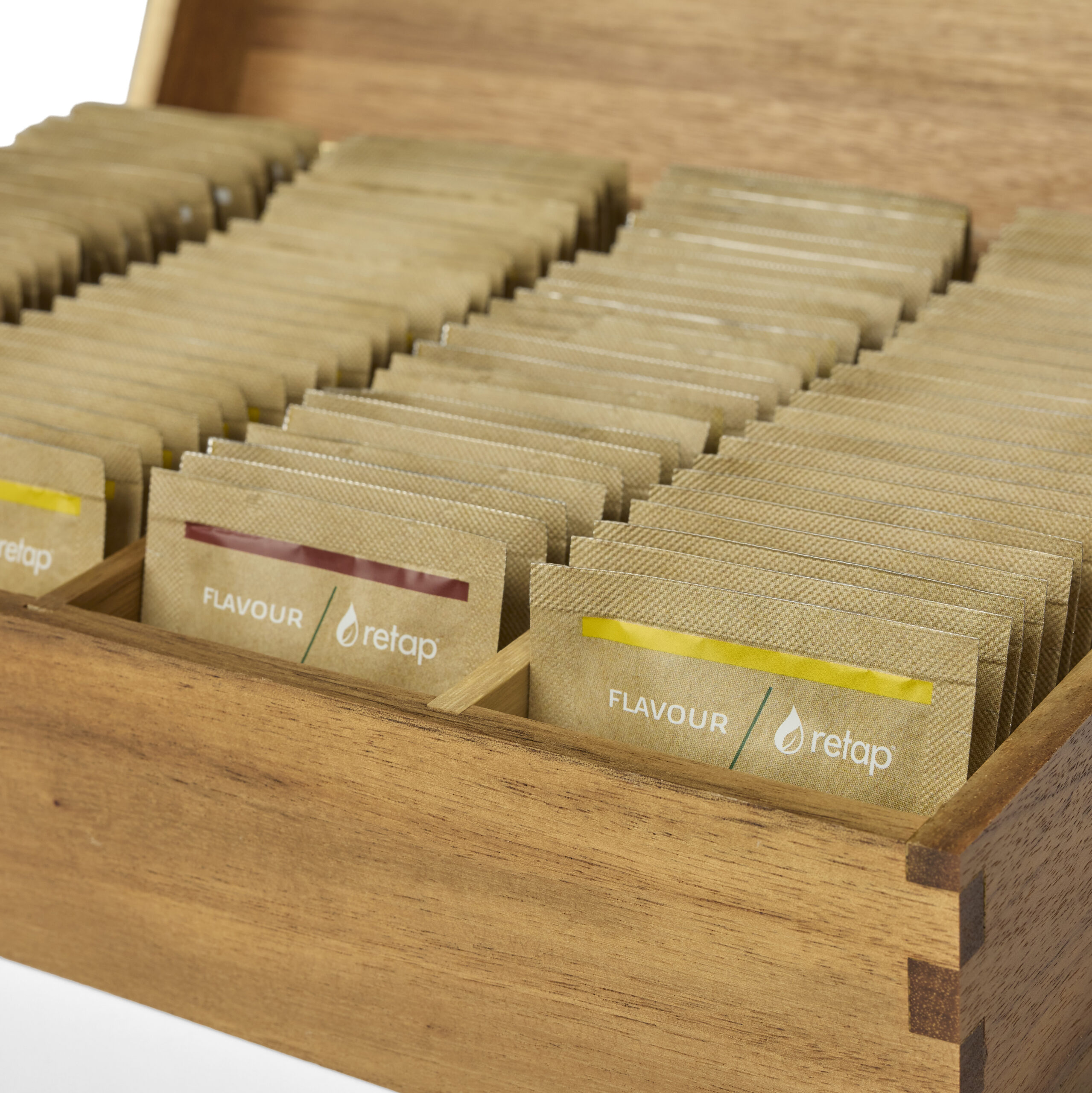 Die Retap Holzbox Groß ist eine geräumige und stilvolle Lösung, um Ihre Retap Flavour Tabs ordentlich und ansprechend zu organisieren. Sie eignet sich ideal für alle, die mehrere Retap Flavours aufbewahren und gleichzeitig Ordnung in Küche oder Büro halten möchten. Gefertigt aus hochwertigem Akazienholz, überzeugt die Box mit warmen Farbtönen und außergewöhnlicher Langlebigkeit – eine stilvolle Ergänzung für jedes Interieur.